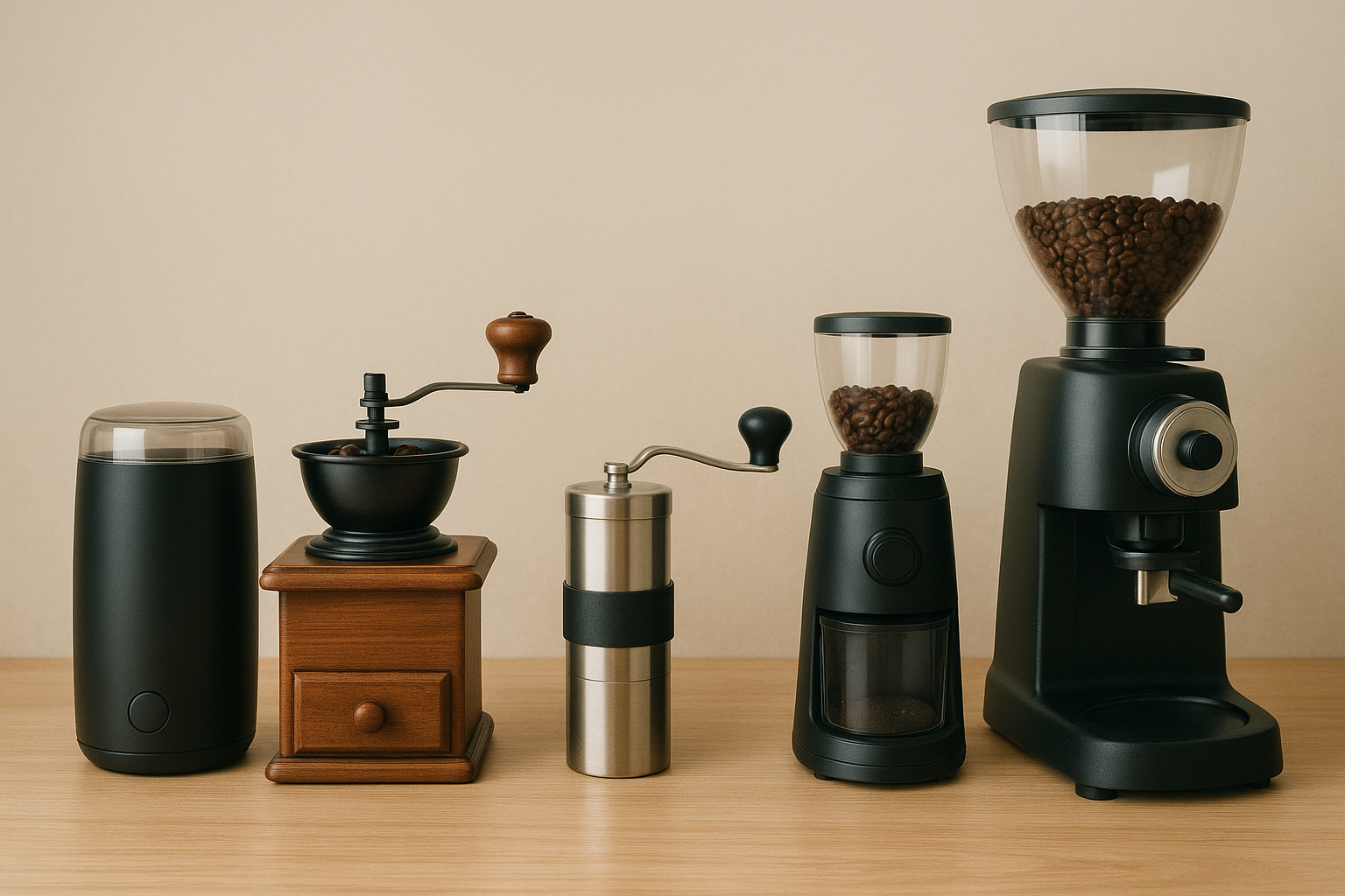 커피의 맛은 원두의 신선도와 함께 분쇄 정도에 크게 영향을 받습니다. 같은 원두라도 어떤 그라인더(Grinder) 를 사용하느냐에 따라 향과 질감이 달라지죠. 이번 글에서는 가정이나 카페에서 주로 사용되는 그라인더의 종류와 특징을 소개합니다.